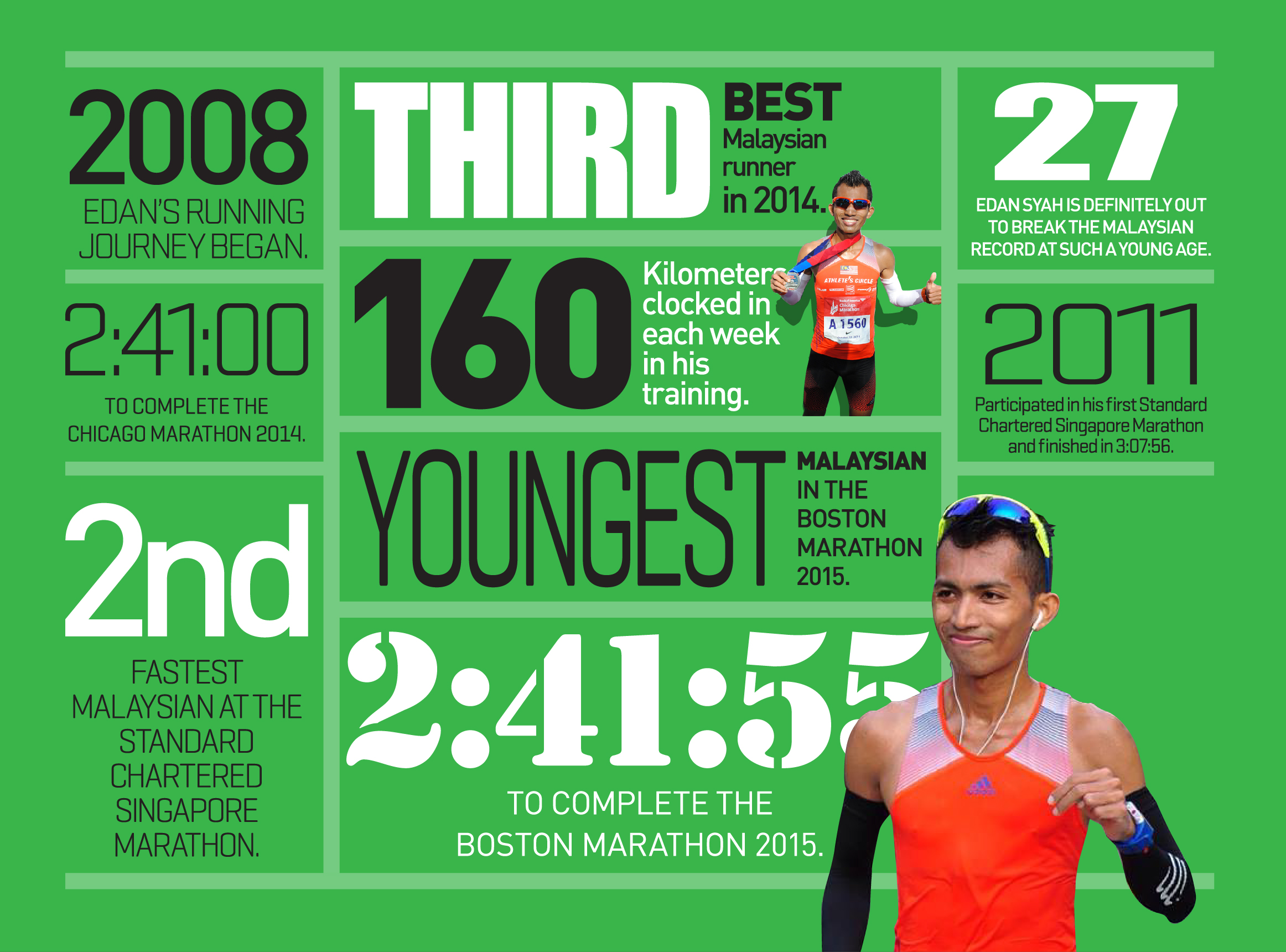 Edan’s first world marathon major left him thirsty for more. In his first race in Chicago, he stood in line with 40,000 runners. What was even more exciting was that he was invited for the race based on a ballot pick. “I had the privilege to stand right in front of other elite runners. It was a moment of truth for me, as I saw all of them put on their game faces. I qualified for the Boston Marathon 2015 with the record time of 2 hours and 41 minutes. I was the youngest Malaysian to race this year.”