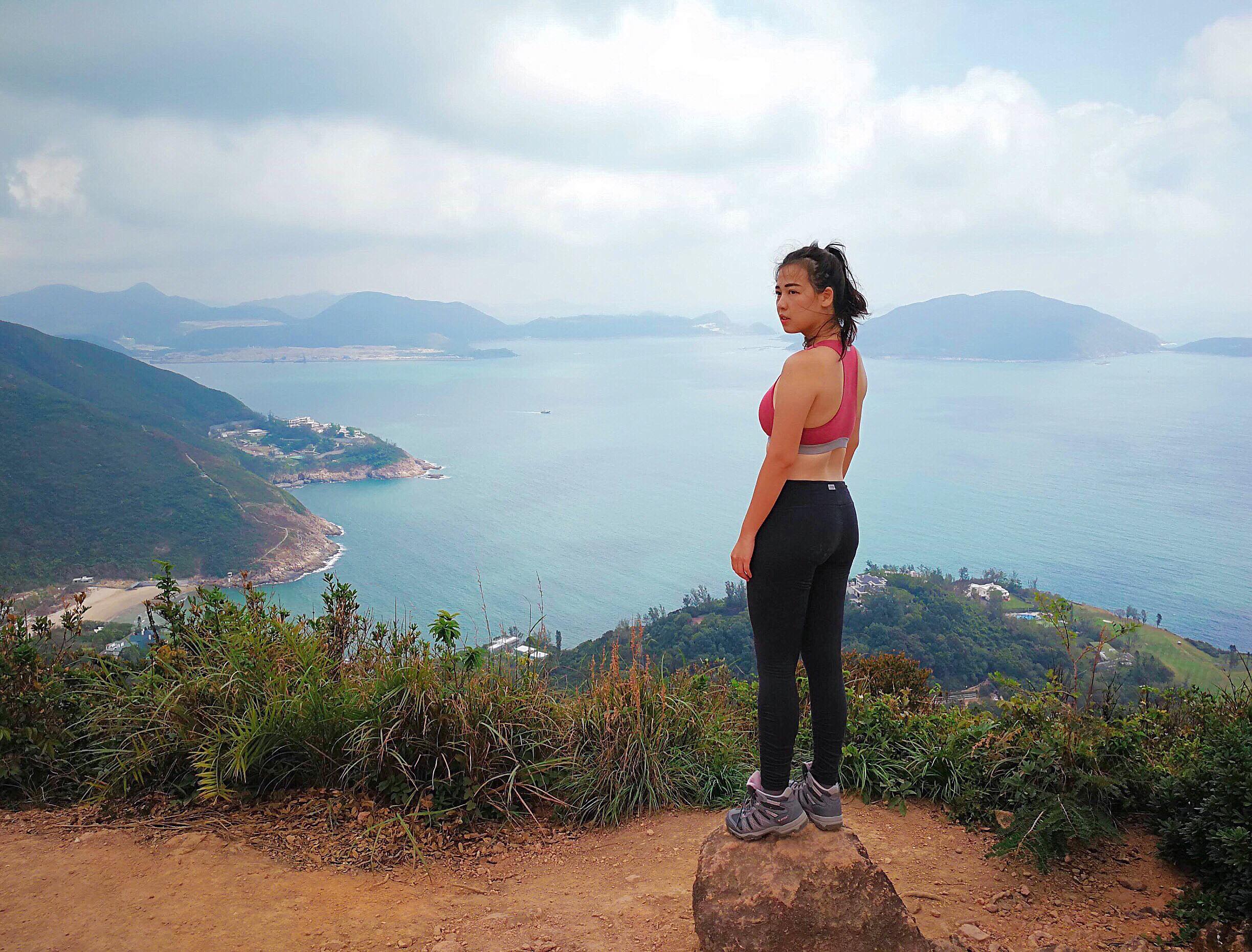 To get the most out of hiking, comfort is key, and the key to comfort is engaging the body with fitting garments. Finding a sports bra and pants that look good, fit well, and give you enough support for your workout is not easy. The good thing was, once we reached the top, we were immediately greeted with an unutterable view over Shek O Beach – and you know it got easier from here.
