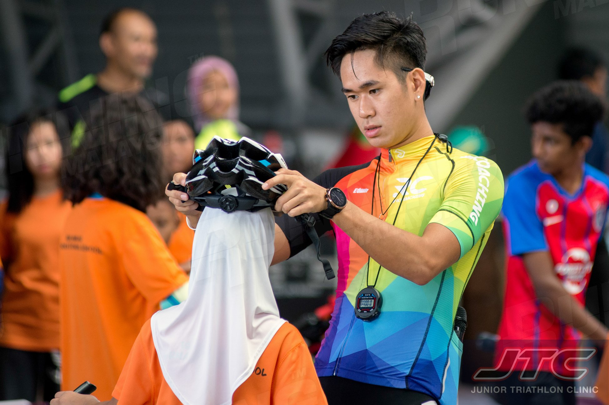 Edwin also taught the children the meaning of transition by going through each step, putting on helmet, shoes, pushing out the bike, and getting on the bike, and the same goes to T2.