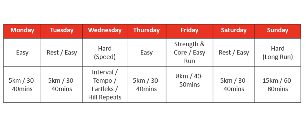 This is a suggested weekly training plan for anyone who has been running regularly. But, feel free to tailor it according to your effort and goal. If you have a big race coming up just after 2 weeks or less after the end of Ramadan, I suggest you keep the speedwork and long run in the plan.
