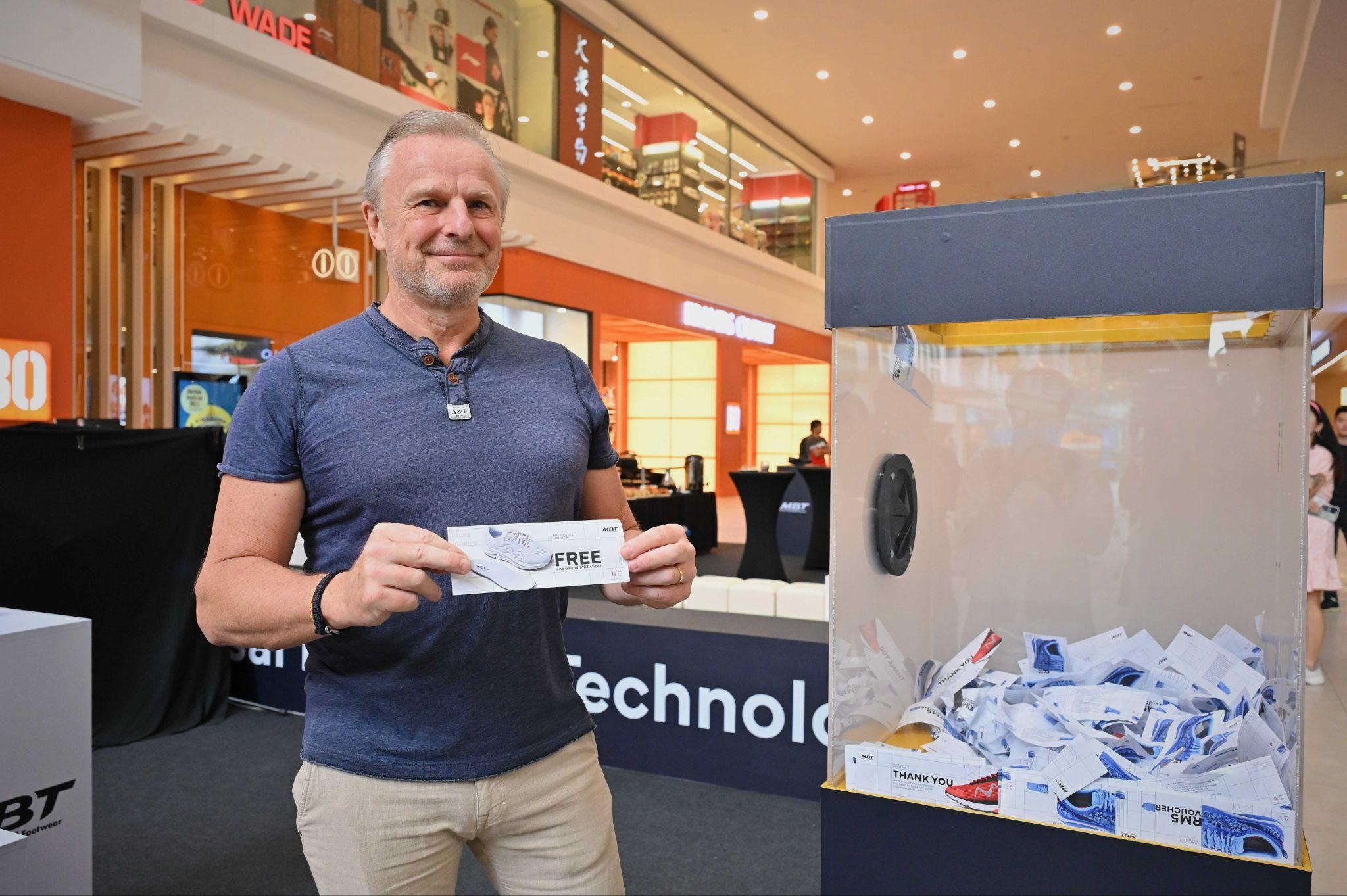 Philippe Le Bretton, Group CEO of MBT Shoes places the golden ticket – a free MBT Shoes voucher – into the wind chamber machine, ready to make a lucky winner’s dreams come true