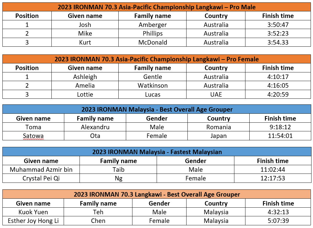 “The good number of participants for the IRONMAN 70.3 Asia-Pacific Championship and IRONMAN Malaysia continues to showcase the value and potential that Langkawi Island brings to this event. We saw how every athlete, both amateur and professional give their best, and what made it more compelling was the fact there were so many locals cheering them at the finish line. We foresee that the IRONMAN 70.3 Langkawi & IRONMAN MALAYSIA will continue to be a signature event in the Asian region for many years to come,” he said.