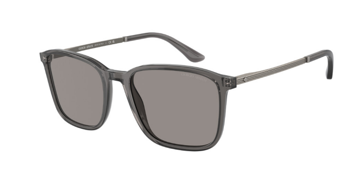 AR8197F Men’s rectangular-frame sunglasses with a sleek, sophisticated design. The understated acetate front is complemented by the metallic touch of linear temples, a contrasting applied diamond, and smooth, glossy acetate tips. Available in black with exclusive grey lenses and transparent grey with grey photochromic lenses.